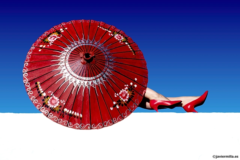 Sombrilla y modelo sobre tapia encalada · Pentax SuperA · diapositiva escaneada 2400ppp · polarizador lineal